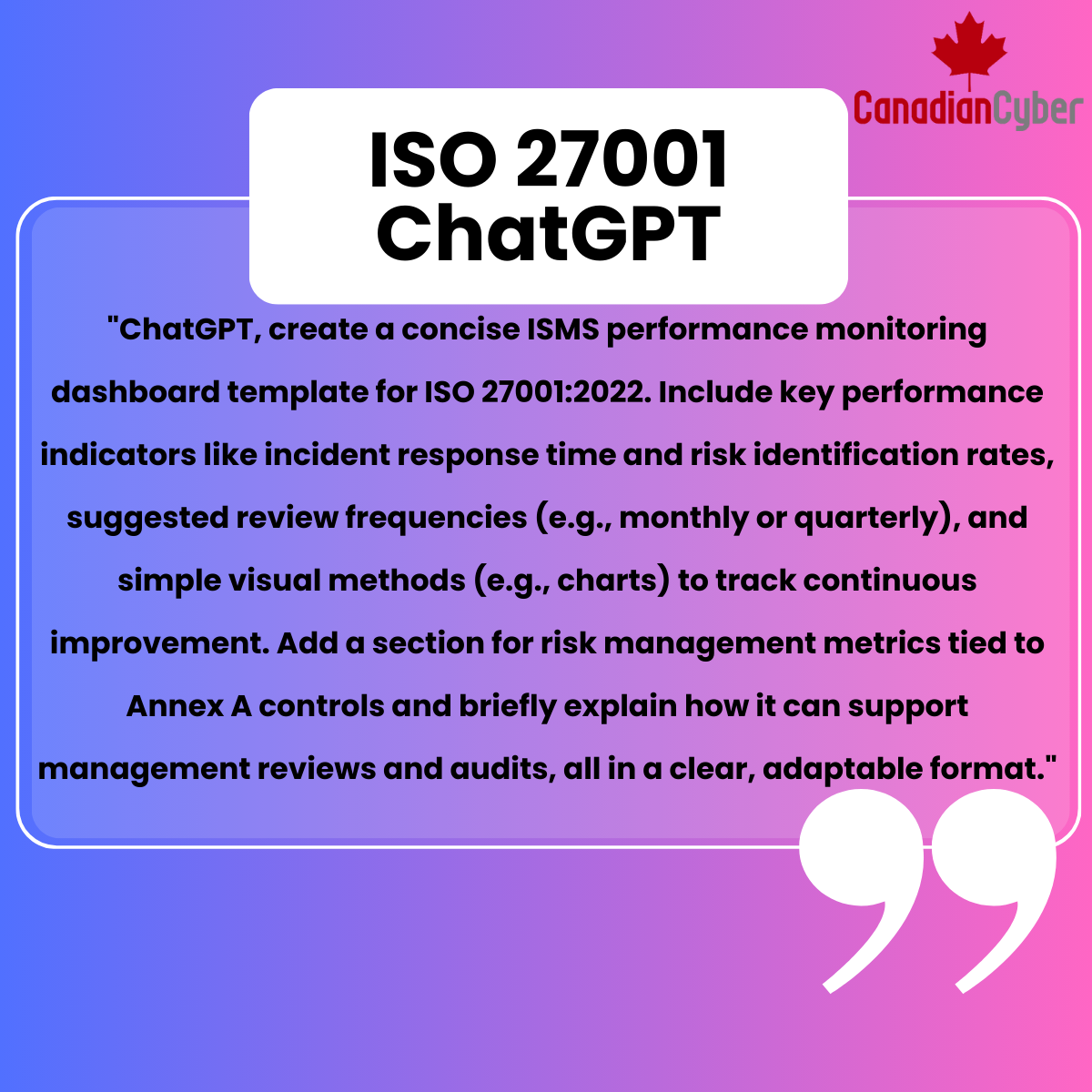 “ChatGPT, create a concise ISMS performance monitoring dashboard template for ISO 27001:2022. Include key performance indicators like incident response time and risk identification rates, suggested review frequencies (e.g., monthly or quarterly), and simple visual methods (e.g., charts) to track continuous improvement. Add a section for risk management metrics tied to Annex A controls and briefly explain how it can support management reviews and audits, all in a clear, adaptable format.”